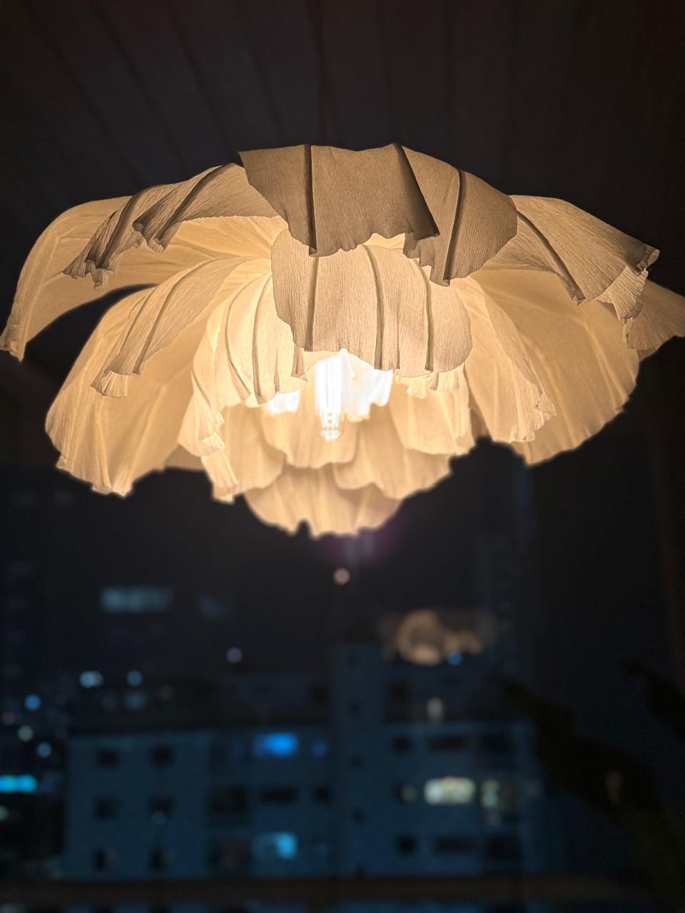 Luminária confeccionada com flor de crepom italiano, bocal e cabo de 2m.