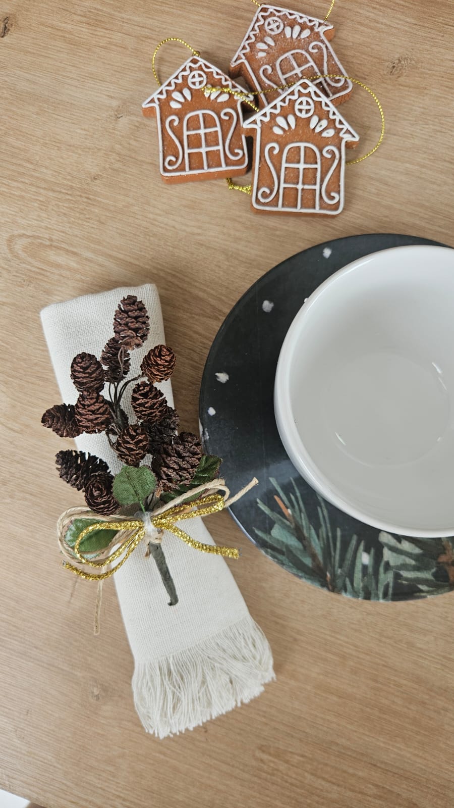 ← VoltarPorta guardanapo confeccionado com mini pinhas, folhagem artificial, laço com fio rústico e dourado.