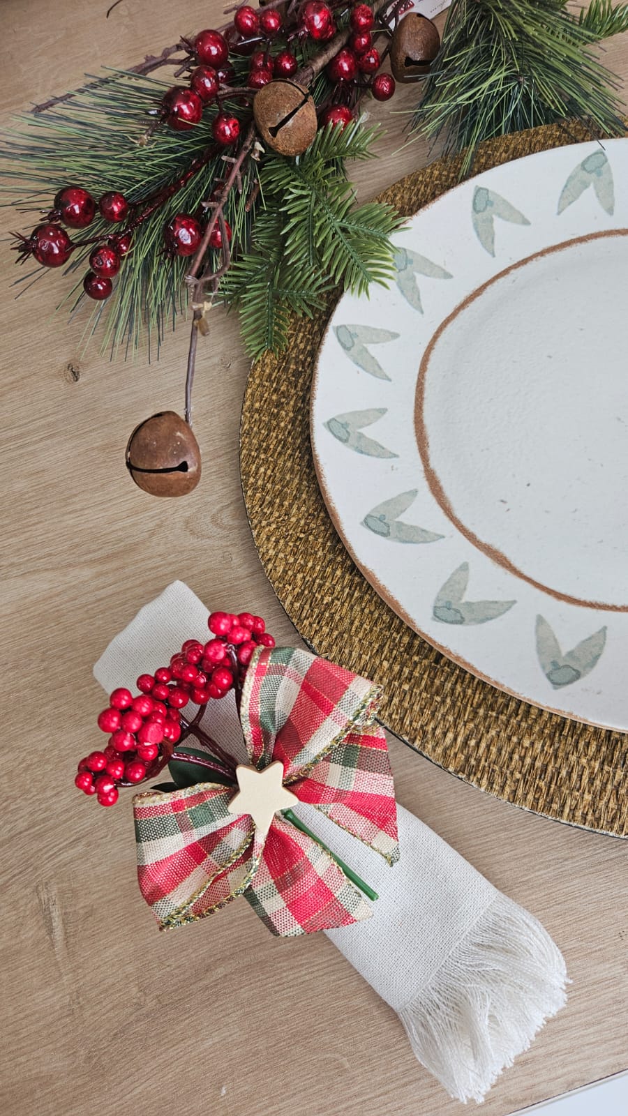 Porta guardanapo confeccionado com laço de fita e enfeites natalinos.
